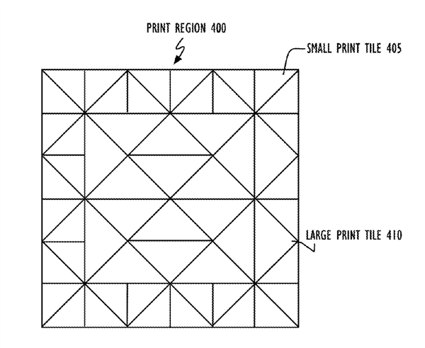 Apple的新發(fā)明將內(nèi)部填充的形狀改變?yōu)椴煌笮〉娜切危搶@麑⑦@些三角形稱為打印瓷磚。