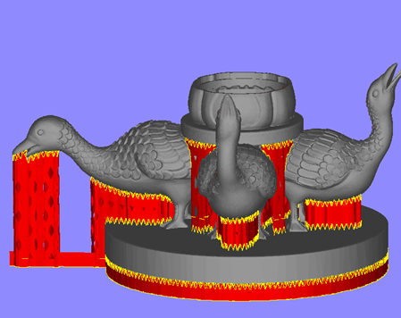 3D打印的損耗還是比較多的,如圖下所示紅色的都是支撐損耗。通常的報價公式是:產品體積*1.3(密度+損耗)*單價*特殊產品的上浮系數,不再另外加上支撐損耗,然而也會有小部分從業單位額外再將這部分損耗加到總價中。